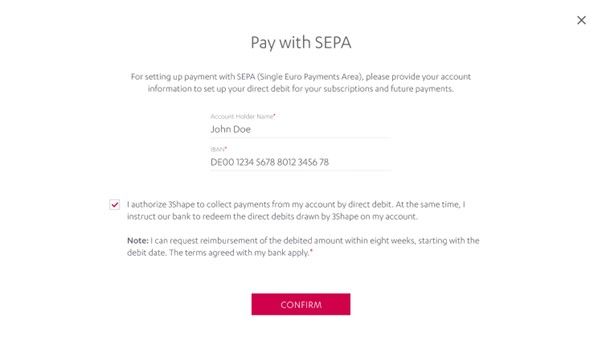 Outcome: Now your subscription will be renewed automatically. The card/IBAN will also be used for further purchases on 3Shape subscriptions management site.